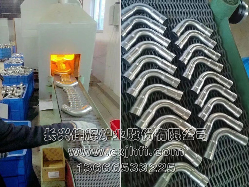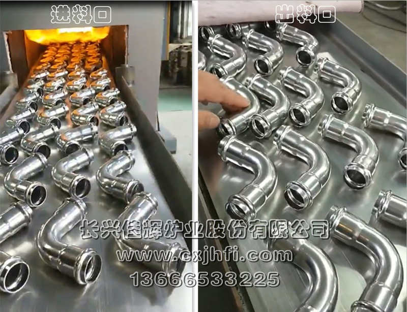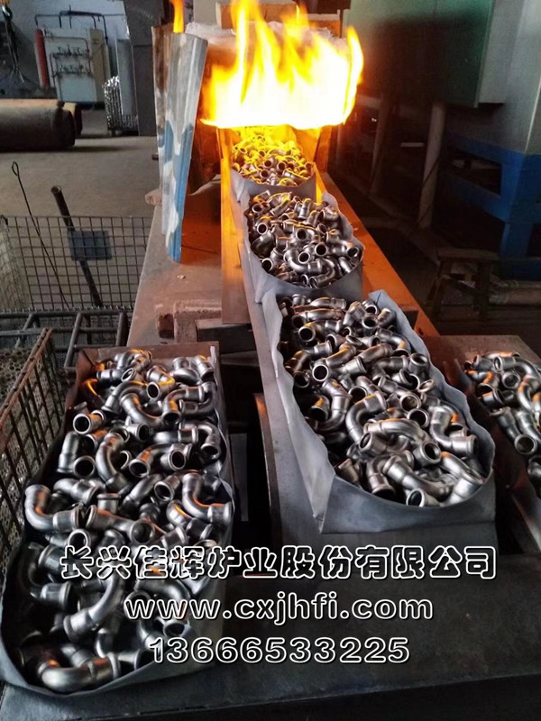 不銹鋼管件光亮退火爐 此設備可根據用戶要求進行定制、定做,服務熱線:13666533225 RST型不銹鋼管件光亮退火爐,適用于不銹鋼三通、彎頭、波紋管、長直管等管件及其他不銹鋼管件、拉伸件、零部件等在可控氣氛(氫氮混合氣體)保護下,進行光亮固溶、去應力退火、消磁等熱處理工藝的專用設備。 金屬及奧氏體產品在彎曲、拉伸、鍛壓、切削、鑄造、焊接等加工 不銹鋼產品退火溫度:950~1080℃,在此溫度下為防止產品與空氣接觸產生氧化(變黑),我公司采用氫氮混合氣體進行保護,保證產品進爐前和出爐后的顏色及光澤度一致。 產品退火處理后,表面光亮無氧化,內應力消除,便于后期的繼續拉伸或成品出貨。本設備取代傳統的退火處理(傳統的高頻退火處理后,產品表面氧化成黑色,需進行后序的酸洗處理,污染環境),本生產線大大提高了生產效率,降低勞動強度及成本,改善工人的勞動環境,達到高效、節能、環保的要求。 該生產線具有控制先進、節能顯著、維修方便等特點,工件輸送采用耐高溫金屬鋼帶或網帶變頻調速,全線加熱區均采用PID自動多區控溫。